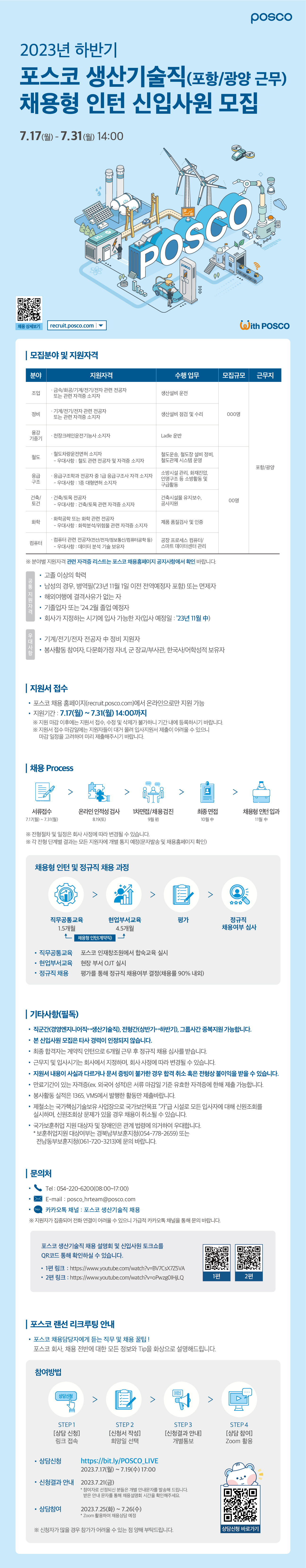 [포스코] 2023년 하반기 포스코 생산기술직(포항/광양 근무) 채용형 인턴 신입사원 모집 (~7/31)