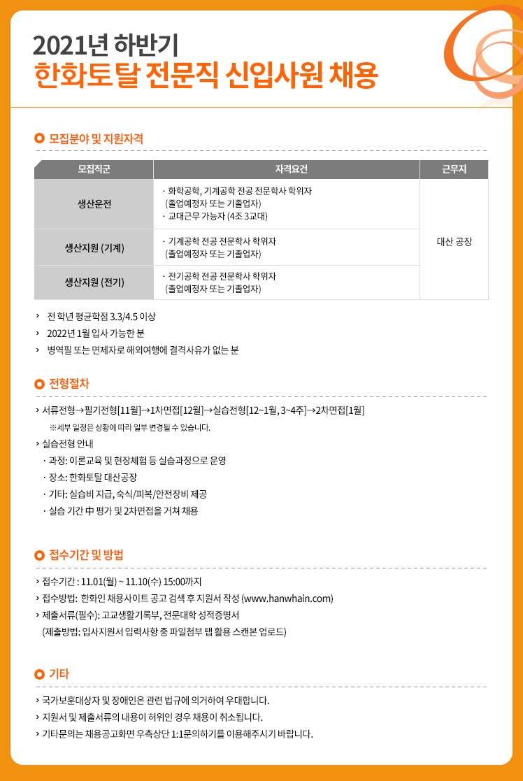 현대오일뱅크/현대케미칼 생산전문인턴 모집